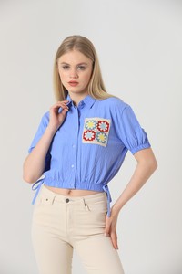 Topshow Mavi Beli Kol Ucu Lastikli Nakışlı Cepli Toptan Gömlek