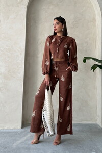 Topshow Nakış Detaylı Toptan Keten Pantolon - Kahve | F1712