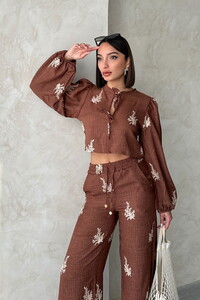 Topshow Önden Baglamalı Nakış Detaylı Toptan Keten Bluz - Kahve | F1711